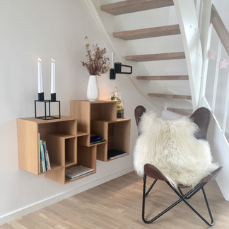Udnyt pladsen under en trappen ved at skabe et fleksibelt område, som kan bruges til forskellige behov, fx et hyggeligt læsehjørne med en flytbar stol eller en lille arbejdsstation.